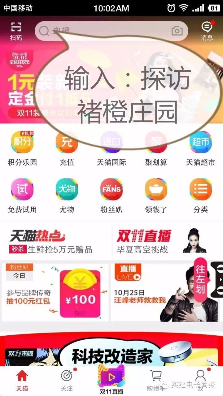 打开手机天猫,在搜索栏直接键入“探访褚橙庄园”六个字,点击搜索即可直接跳转至直播页面。(如下图)
