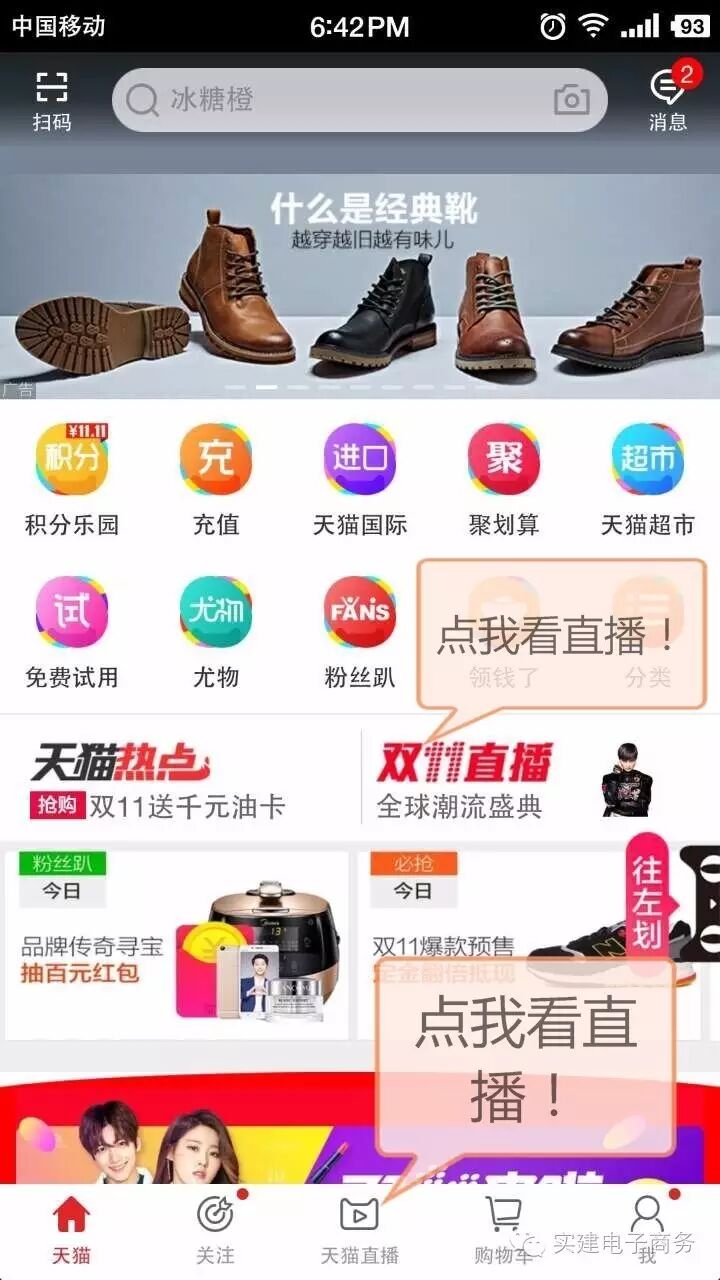 届时,打开手机天猫,首页即可在两个位置观看天猫直播。如图标识。